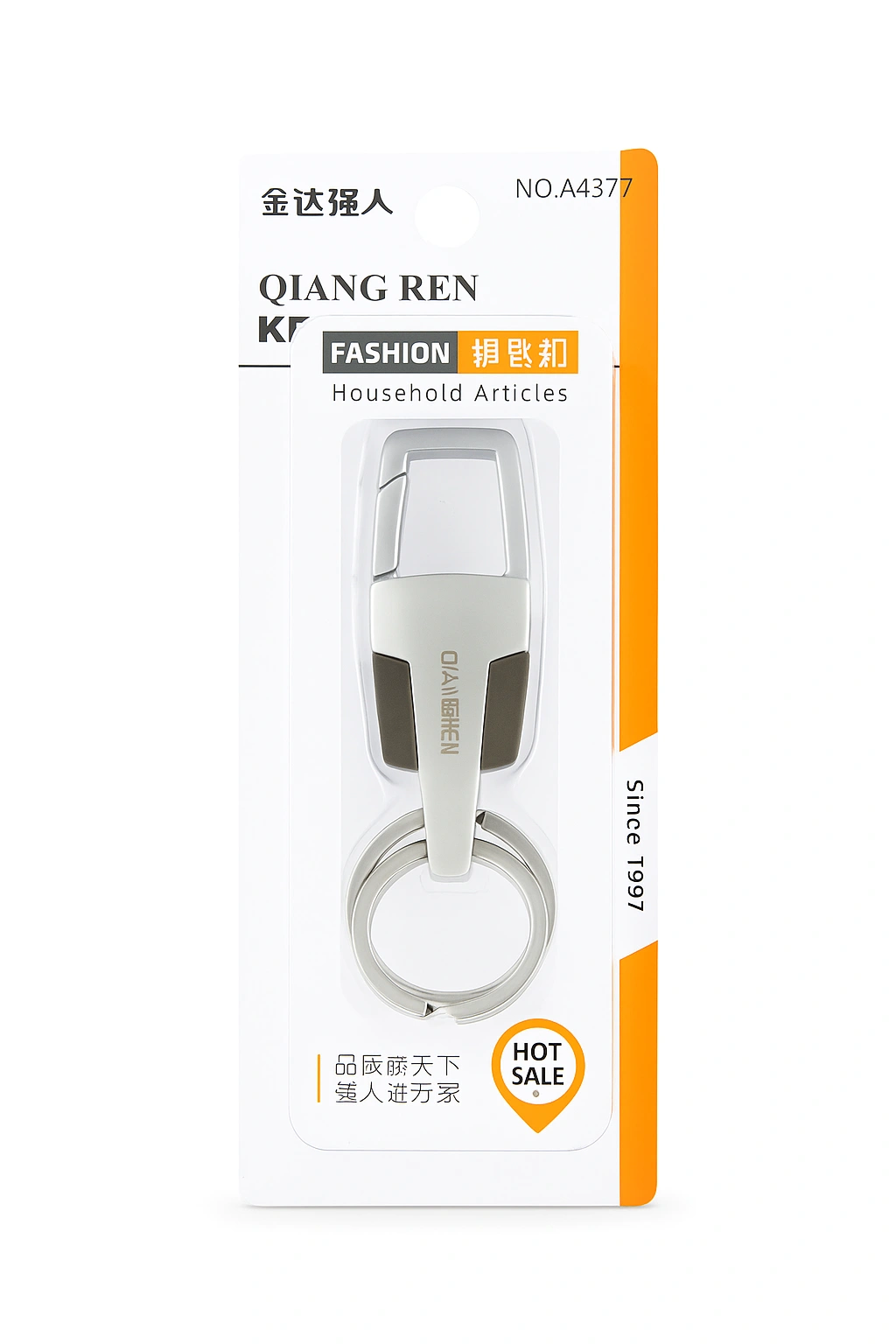 A durable metal keychain with a polished finish, designed for long-lasting use while adding a refined touch.
